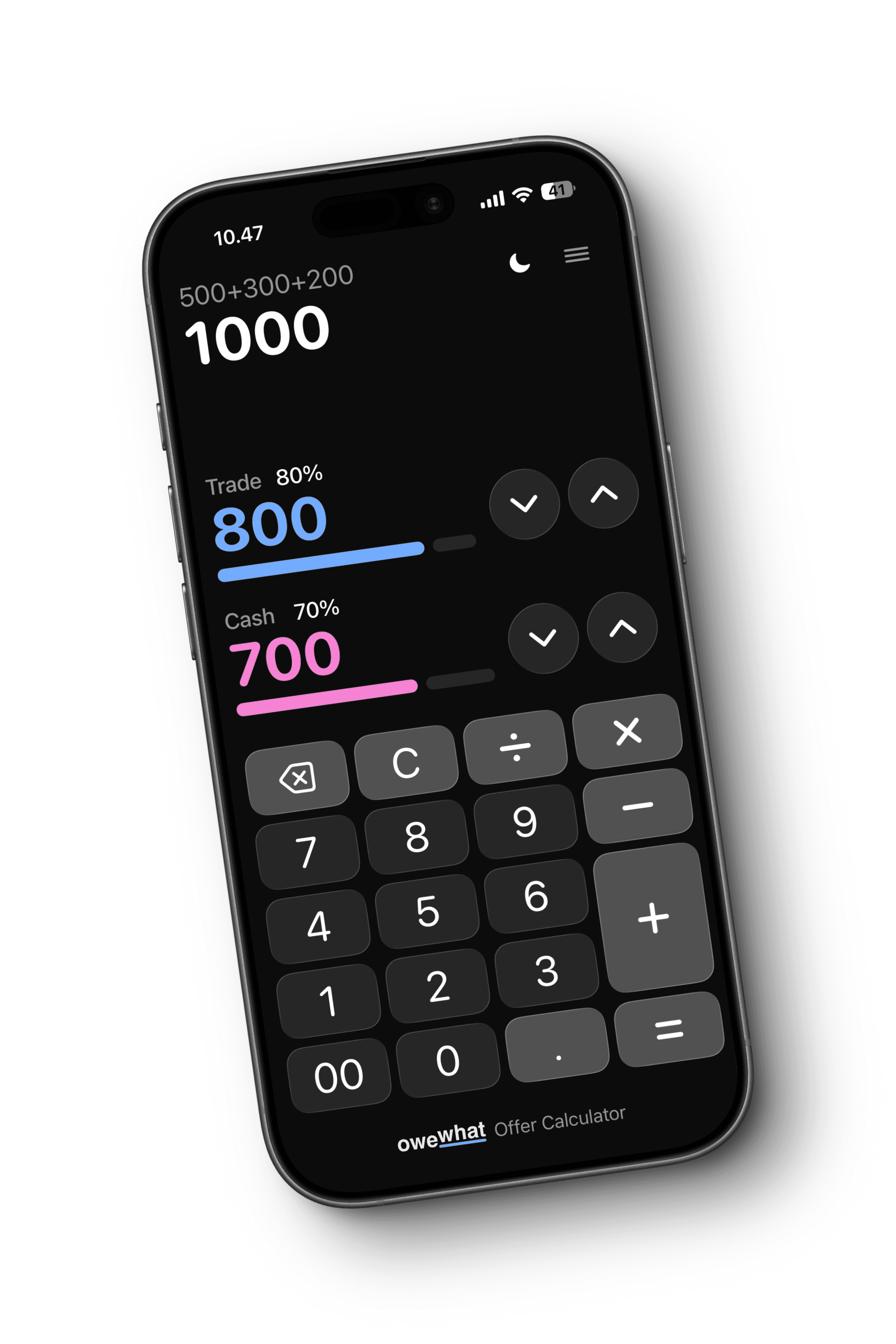 Your calculator, upgraded with an always-on trade & cash offer display that updates in real time as you add values.